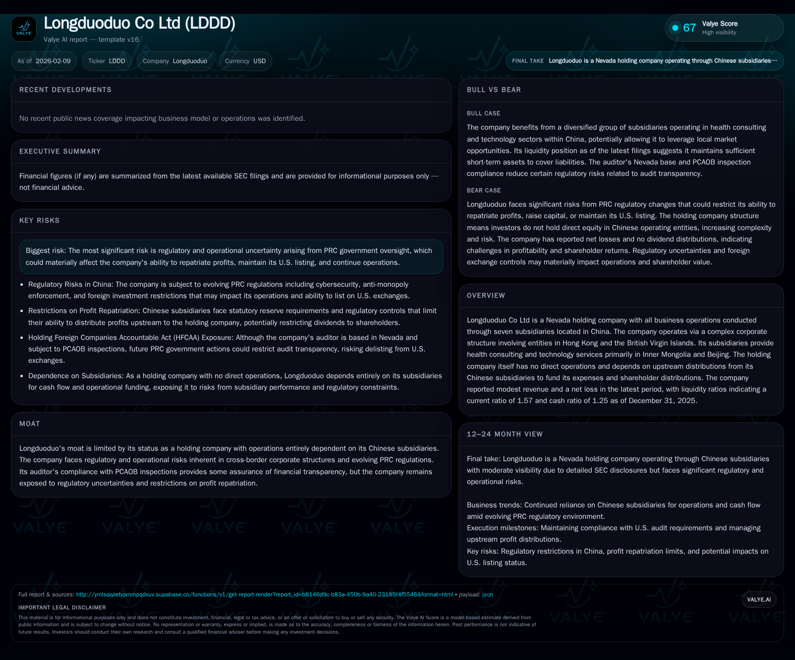 Longduoduo Co Ltd operates through a layered corporate web spanning Nevada, Hong Kong, the British Virgin Islands, and China, with all revenue stemming almost exclusively from a single partner, Inner Mongolia Honghai Health Management Co. Ltd. This outsized dependence, combined with regulatory uncertainties tied to cross-border operations and reliance on third-party healthcare providers, underpins its fragile financial position. While modest revenue and limited liquidity provide some operational runway, the looming expiration of key contracts in mid-2026 and PRC regulatory scrutiny signal caution for the company’s strategic outlook.