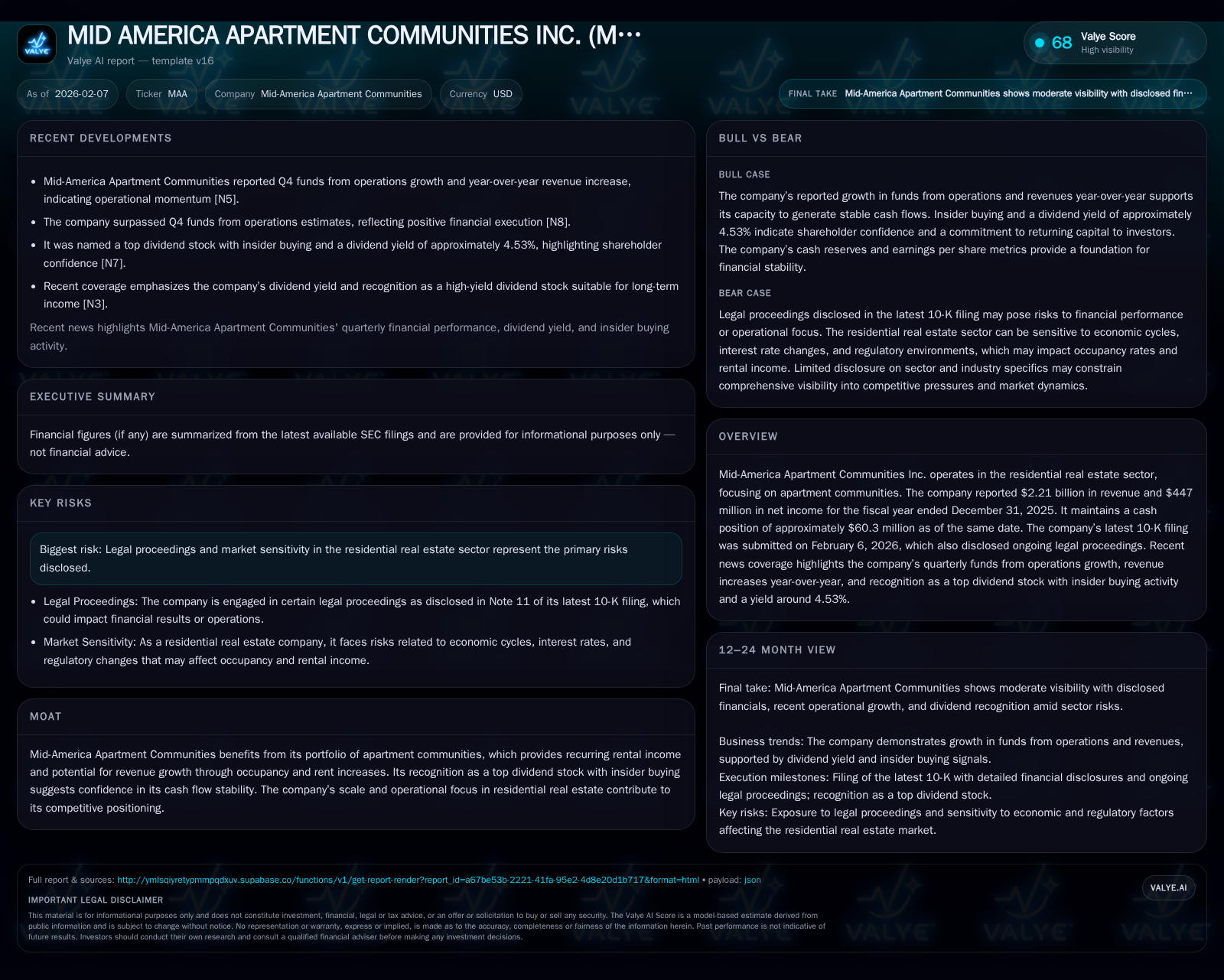 Despite compelling operational metrics, scrutiny around legal proceedings disclosed in MAA’s February 2026 Form 10-K cannot be overlooked [S1], [valye_report_excerpt]. While details remain limited publicly, ongoing litigation inherently introduces uncertainty which could impact expenses or reputation if unresolved unfavorably.